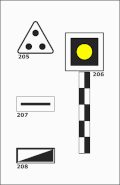 | • 206: přejezdník - blikající žluté světlo indikuje, že zabezpečovací zařízení přejezdu je v činnosti, případně závory jsou zavřeny (sklopeny) - návěstidlo může být doplněno tabulkou s počtem přejezdů, které kryje. Černo-bílá deska na sloupku nemusí být osazena - na některých tratích se používají přejezdníky původního provedení, podobné trojúhelníkovité předvěsti přejezdníku, pouze jednotně v celé trati. | ||