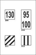 | • 211: začátek snížené rychlosti - určuje začátek úseku se sníženou rychlosti daný předvěstí • 212: konec snížené rychlosti - rychlost možno zvýšit až když poslední vozidlo soupravy mine tuto návěst | ||
