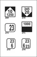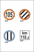 | • 217: vzdálenostní tabulka - na trati: udává kilometráž od kterého místa platí změna rychlosti - na nádraží: na nádraží: používá se podle předpisů provozovatele s uvedením vzdálenosti změny rychlosti | ||