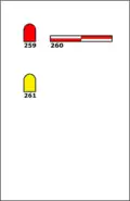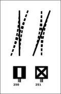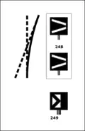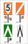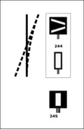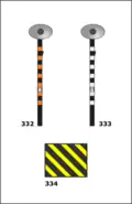 | • 259, 260: námezník - udává místo, kde se ještě mohou bezpečně míjet kolejová vozidla na sbíhajících se kolejí u výhybky. Na úzkokorozchodných drahách s přepravou normálněrozchodných vozidel mohou být použity zvláštní námezníky pro normální a úzkorozchodná vozidla | ||