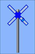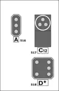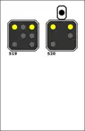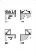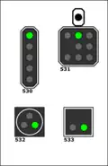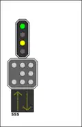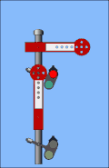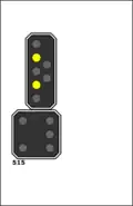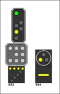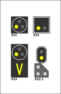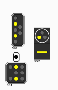 | • 557: směrový signál vlaková cesta je postavena z nebo na příslušnou skupinu kolejí nebo směr - umisťuje se na hlavní návěstidlo typu L | ||