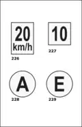 • 226: povolená rychlost používá se v depu, na kolejových brzdách, vahách apod. • 227: rychlosti pro ozubnici umísťuje se před náběhem ozubnice, cca 150 m • 228: začátek ozubnice - v německy mluvících kantonech A, ve francouzsky mlucících kantonech písmeno C • 229: konec ozubnice - v německy mluvících kantonech E, ve francouzsky mlucících kantonech písmeno F |