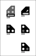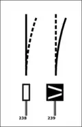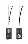 | • 240: výhybka postavena doleva • 241: výhybka postavena doprava - tato návěstidla se použijí u výhybek se stejnou dovolenou rychlostí v obou větvích, v noci je lucerna uvnitř osvětlena bílým světlem, symboly jsou prosvíceny přes mléčné sklo | ||