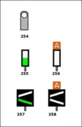 | • 255, 257: výhybka postavena v základní poloze - indikace polovičním zeleným polem lucerny … nebo … • 256, 258: výhybka postavena v základní poloze - indikace tabulkou s písmenem "A" (němčina) nebo "T" (francouzština, italština) - tyto návěsti povolují jízdu do samovratné výhybky po hrotu | ||