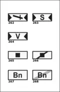 | Nádražní tabulky • 267, 268: začátek/konec obvodu stanice - u typu návěstidel "N" se používá vždy, u typu návěstidel "L" se používá podle potřeby - na tabulce je uvedena zkratka názvu stanice | ||