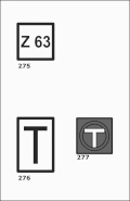 | Telefon • 276: označení místa s telefonem, v tunelu osvětlené • 277: indikace vyzvánění telefonu - povinnost strojvedoucího spojit se s dispečerem platí pro zastavující vlaky a posun - bílý blikající znak "T" | ||