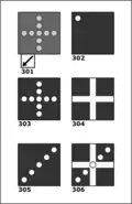 | • 303, 304: stůj pro posun - posunující díl musí zastavit před návěstidlem nebo námezníkem, platí-li návěstidlo pro více kolejí • 305, 306: volno pro posun zahájení nebo pokračování jízdy posunujícího dílu | ||