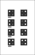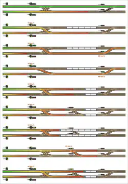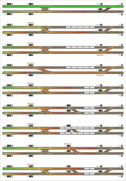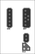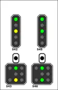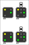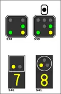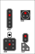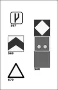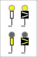 | • 571, 573: kusá kolej (ve dne) pro jízdu vlaku stůj před výhybkou postavenou na kusou kolej • 572, 574: kusá kolej (v noci) | ||