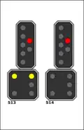 | • 513: stůj (předvěst zobrazuje výstrahu pokud hlavní návěstidlo na stejném místě ukazuje stůj) … nebo … • 514: stůj (předvěst je zhasnuta pokud hlavní návěstidlo na stejném místě ukazuje stůj) | ||