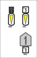 | • 559: jízdní indikáor indikuje, že hlavní návěstidlo zobrazuje jízdní návěst (povolení jízdy) pro tuto kolej ve spojení s návěstí 560 - tabulka s indikátorem | ||