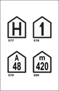 | • 567: omezení rychlosti (až) na první výhybce pro návěstní soustavu typu "L" – omezení rychlosti platí až od první výhybky, umisťuje se na předvěsti vjezdového návěstidla • 568: upozornění na vjezdové návěstidlo pro návěstní soustavu typu "N" určuje, že další návěstidlo je vjezdové • 569: traťová rychlost pro návěstní soustavu typu "N" – od tabulky platí traťová rychlost, umísťuje se před hlavní návěstidlo • 570: upozornění na vliv vlakového zabezpečovače umísťuje se před nebo přímo na předvěst vlakový zabezpečovač účinkuje mimo návěsti výstraha i při dalších jednotlivých návěstech. | ||