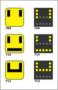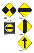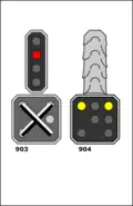 • 905, 906: 'dočasně platné návěstidlo černě lemovaný bílý trojúhelník - zhasnutá návěst nemá žádný význam (ani není v poruchovém stavu) |