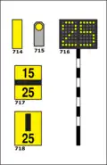 | • 715: neutrální úsek odděluje dvě trakční soustavy, používá se na nádražích se zónami s přepínatelným napájením - v jízdě se nesmí pokračovat se zdviženým sběračem - neplatí v případě, že sběrač je přizpůsoben pro obě trakce a je vypnut hlavní vypínač | ||