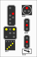 | • 809: přivolávací návěst (hlavní návěstidlo "L") blikající červené světlo - u dalšího návěstidla se očekává signál stůj nebo výstraha, jde-li o samostatnou předvěst | ||