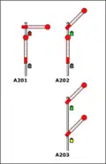 | • A202: volno - rychlost podle traťového předpisu, horní rameno šikmo, spodní v zákrytu - pokud je osazeno) - v noci zelené světlo | ||