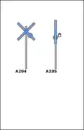 • A204: posun zakázán - ramena postavena ve tvaru kříže - v noci modré světlo |