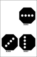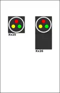 | U hlavních návěstidel, která jsou tvarově shodná s předvěstí (Xx11-Xx13), se používá bílá deska s černým orámováním a černým bodem ve středu. Deska se osazuje nad návěstidlo. | ||