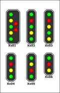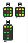 | Vyobrazení Xx01-Xx06, Xx11-Xx13: rozmístění světel hlavního návěstidla, podle předávaných návěstí nemusí být všechna světla osazena. | ||