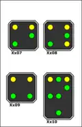 | Vyobrazení Xx07-Xx10: rozmístění barevných světel předvěsti, podle předávaných návěstí nemusí být všechna světla osazena. | ||