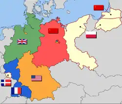 Německá demokratická republika byla založena v sovětské zóně, zatímco Spolková republika („Západní Německo“) byla složena ze tří západních zón (pův. tzv. Trizónie). Východní Německo bylo satelitním státem Sovětského svazu.[2] Sovětské okupační úřady začaly převádět správní odpovědnost na německé komunistické vůdce v roce 1948 a NDR začala fungovat jako stát 7. října 1949. Sovětské síly však v zemi zůstaly po celou dobu studené války. Až do roku 1989 byla NDR řízena Socialistickou jednotnou stranou (SED), i když další strany byly formální součástí její alianční organizace, Národní fronty.[3] SED zavedla na školách povinnou výuku marxismu-leninismu a ruštiny.[4]