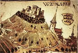 Ilustrace hradu u Weinsbergu, obklopeného vinicemi. U Weinsbergu sedláci hrad přemohli a zmasakrovali šlechtické statkáře.