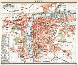 - ↑ Adresáŕ královského hlavního města Prahy, 1910, III, S. LVII, links oben; es gab außerdem nur tschechische höhere Mädchenschulen: Gymnasium Minerva (1890), Gymnasium in Königliche Weinberge (Vinohrady), Korunni 4 (wahrscheinlich kirchlich); Lyceen in Praha VII (1911) und Königliche Weinberge (1908); sowie die Städtische Höhere Mädchenschule in der Wassergasse (Vodičková) 24 in der Neustadt (Plan 1885 D4, rechts)