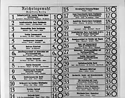 | Národně socialistická německá dělnická strana (NSDAP) | 33,1% | ▼ -4,2 | 196 | ▼ -34 | |