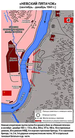 Sověti obsadili toto předmostí v září 1941, v dubnu 1942 byli jednotkami wehrmachtu zatlačeni za Něvu. Znovu byl Něvský pětník dobyt v září 1942 a 17. února 1943 se v operaci, které velel Georgij Konstantinovič Žukov, podařilo blokádu prolomit a spojit se s hlavním proudem sovětských vojsk. Boje byly mimořádně tvrdé. Počet sovětských vojáků, kteří padli při obraně Něvského pětníku, se odhaduje na padesát tisíc[1] až dvě sta tisíc (V. V. Bešanov). Průzkum v šedesátých letech objevil v krychlovém metru půdy 10 kg kovu.[2] Na místě bojů byl roku 1972 vztyčen pomník nesoucí verše, které věnoval padlým hrdinům Robert Rožděstvenskij.