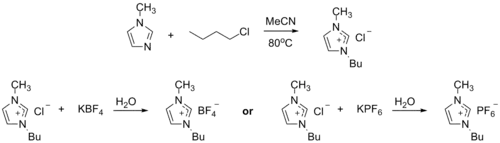 - ↑ DUPONT, J.; CONSORTI, C.; SUAREZ, P.; DE SOUZA, R. Preparation of 1-Butyl-3-methyl imidazolium-based Room Temperature Ionic Liquids. Org. Synth.. 2004. Dostupné online.; Coll. Vol.. S. 184.