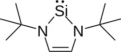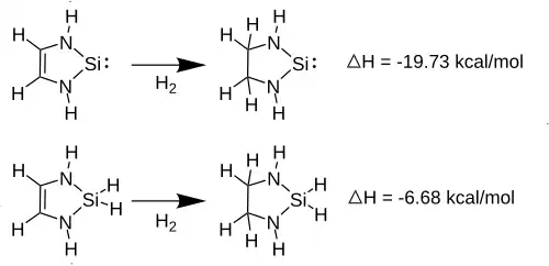 - ↑ a b c DENK, Michael; GREEN, Jennifer C.; METZLER, Nils; WAGNER, Matthias. Electronic structure of a stable silylene: photoelectron spectra and theoretical calculations of Si(NRCHCHNR), Si(NRCH2CH2NR) and SiH2(NRCHCHNR). Journal of the Chemical Society, Dalton Transactions. 1994-01-01, s. 2405. ISSN 0300-9246. doi:10.1039/dt9940002405.
