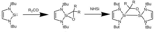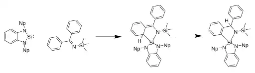 Iminy nereagují s cyklickými silyleny v jednoduchých adicích: benzo-NHSi reagují s diiminem a ortho uhlíky N-terc-butylfenyliminu za tvorby pětičlenných kruhů obsahujících křemík z NHSi, jeden uhlík a dusík z iminu a ipso a para uhlíky fenylu, přičemž u meziproduktu je aromaticita fenylové skupiny narušená.[15]