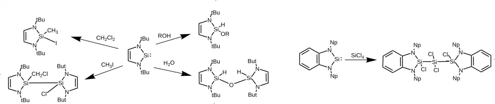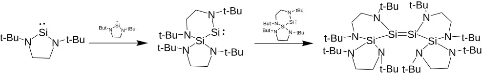 V koncentrovaných roztocích nasycený nesubstituovaný silylen [tBuN-CH2CH2-tBuN]Si: vytváří tetramer obsahující dvojnou vazbu Si-Si. Nejprve se jedna molekula NHSi naváže dvojvazným křemíkem na vazbu N-Si jiné molekuly, což vytvoří bicyklický meziprodukt s čtyřvazným křemíkem napojeným na dvojvazný silylen. Tento dimer se poté sám dimerizuje za vzniku čtyřkřemíkatého silenu délky vazeb Si=Si v něm jsou 229 pm. Reakcí tetrameru s methanolem se tvoří smíšený adukt dimeru a methanolu, ne asukt silenu a dimeru. Dvojná vazba mezi terc-butylovanými NHSi je nnestabilní.[11] Nenasycené a substituované nasycené NHSi, jako je 4,5-dimethyl-[tBuN-CHMeCH-tBuN]Si:, takto nereagují a zůstávají monomerními.[12]Podobně nesubstituované NHSi reagují s N heterocyklickými germyleny za vzniku křemíkatých germenů.[3]