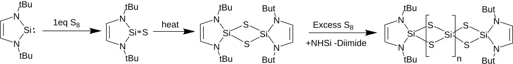 Reakcemi NHSi s kyslíkem se štěpí diiminové řetězce a vzniká oxid křemičitý, pravděpodobně přes dva NHSi-dioxomůstkové meziprodukty. Reakcí s jedním ekvivalentem S8 vznikají dithio-můstkové komplexy. Tvorba dithiodimeru probíhá přes thiosilylon, obsahující dvojnou vazbu Si-S. Nadbytek síry vede k oligomeům typu NHSi(S2)(SiS2)nNHSi a současnému odštěpení diiminu. Obdobná reakce se selenem je výrazně pomalejší, ale utvářejí se při ní pouze di-NHSi s diselenovými můstky.[13]