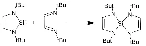 Dieny, včetně heterodienů, jako je benzil nebo N,N'-diterbutyl-1,4-diazabutadien ([tBuN-CH=CH-tBuN]), vstupují do [4+1] reakcí za vzniku molekul s dvěma pětičlennými kruhy, které mají společný atom křemíku.[2][4]