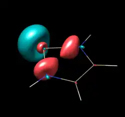 Výpočetními studiemi a fotoelektronovou spektroskopií byla získána podrobnější elektronová struktura NHSi. Příslušné π-vazebné orbitaly nenasycených pětičlenných NHSi lze jako molekulové orbitaly popsat jako spojení orbitalů diiminového řetězce, podobného pí orbitalům butadienu, a 3s a 3p orbitalů Si. Fotoelektronová spektra nenasyceného [tBuN-CH=CH-tBuN]Si: obsahují HOMO se třemi vrcholy, na -6,96 eV, -7,13 eV a -7,28 eV, potvrzující překryv 3py orbitalu křemíku s π3 diiminu, podobnými buta-1,3-dienu. HOMO u odpovídajících čtyřvazných Si-hydrogenovaných sloučenin nemají prázdné 3py orbitaly křemíku a energie π3 jsou destabilizovány na -6,56 eV, což je způsobeno dodáváním náboje v molekule silylenu z N na Si. HOMO-1 je ve stejné rovině jako volný pár Si zapojený do dodávání elektronů. Nebyl nalezen žádný rozdíl mezi HOMO-2 nenasyceného silylenu a příslušného orbitalu odpovídajícího silanu. Tento orbital byl původně považován za podobný π2 orbitalu diiminu, ovšem později přiřazen volným elektronovým párům dusíku. Obě tyto možnosti se ovšem symetricky nemohou překrýt s žádným orbitalem Si. HOMO-2 po hydrogenaci nemění svou energii, což naznačuje, že elektronové vlastnosti se hydrogenací příliš nemění a vliv N na Si ohledně dodávání π-elektronů do HOMO a HOMO-3 není velký. Výpočty také ukázaly zvýšené rozdíly energií u sloučenin typu N-H model (oproti N-tBu).[5][9] Studie srovnávající benzo-NHSi a etheneovité nenasycené NHSi ukázala, že HOMO má o 0,36 eV a volný pár Si o 0,34 eV nižší energii NHSi, což naznačuje odtahování elektronů fenylenovými kruhy a snížení nukleofility u benzo-NHSi.[9]