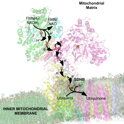 S NADH reduktázou se nejprve asociuje redukovaný koenzym NADH a předává své elektrony celému multiproteinovému komplexu. Z jedné NADH přichází na komplex I dva elektrony a předávají je na FMN, z něj proudí elektrony na FeS klastry a z nich konečně na koenzym Q.[3] Výhodou přenašečů FMN a ubichinonu je, že mají tři oxidační stavy a mohou tedy přijmout oba elektrony od NADH. Následně mohou postupně odevzdávat elektrony na další přenašeč elektronů, tzn. na cytochromy v komplexu III.[1]