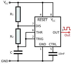 Doba, po kterou se kondenzátor nabíjí je ovlivněna velikostí jeho kapacity a velikostí odporů R1, R2. Naopak velikost vybíjecí doby je závislá pouze na velikosti kondenzátoru a rezistoru R2. Rezistor R1 nemá na vybíjení vliv, protože kondenzátor se vybíjí přes tranzistor (pin č. 7).