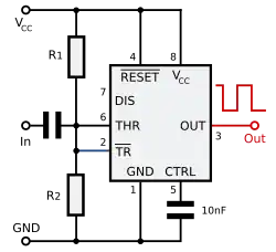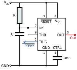 Po vyslání impulzu na pin č. 2 se kondenzátor C začne nabíjet přes rezistor R, protože vybíjecí tranzistor je uzavřen. Jakmile se kondenzátor nabije na 2/3 napájecího napětí, komparátor K1 resetuje KO RS, což způsobí změnu výstupní úrovně a zároveň otevření vybíjecího tranzistoru. Kondenzátor je spojen se zemí a tím se vybije. V tomto stavu obvod setrvává do příchodu dalšího spouštěcího impulzu.