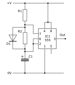 Tedy rezistor R1 = 0 Ω. Rezistor R1 však musí mít nenulovou hodnotu odporu, protože při vybíjení kondenzátoru přes kolektor vybíjecího tranzistoru by nastal zkrat napájecího zdroje, což může v nejhorším případě způsobit zničení tranzistoru. Rezistor R1 tedy nesmí být v zapojení vynechán. Tento problém se dá ovšem snadno vyřešit připojením diody (doporučený typ 1N4148) paralelně k R2, takže se C nabíjí pouze přes jeden odpor a diodu a přes druhý odpor se vybíjí. Potom platí: