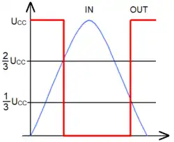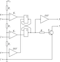 Napájecí napětí, přivedené na pin 8 (VCC), se na rezistorech R1 – R3 rozdělí na 1/3 a 2/3 své hodnoty, čímž se nastaví komparační úrovně dvou vstupních operačních zesilovačů, které jsou zapojeny jako komparátory. Vstupem 5 (CTRL) lze tyto úrovně měnit. Výstupy obou komparátorů jsou spojeny se vstupy klopného obvodu RS. Tento KO má ještě jeden, nulovací vstup (pin č.4, RESET), kterým je možné překlopit jej do stavu logické nuly nezávisle na jeho vstupech.