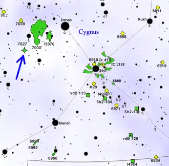 NGC 7027 je velmi mladá a hustá planetární mlhovina[7] v souhvězdí Labutě s magnitudou 8,5.[8] Od Země je vzdálená přibližně 3 000 světelných let.[9] Objevil ji Édouard Stephan v roce 1878.[6][10] Jde o jednu z nejmenších planetárních mlhovin a přitom je zdaleka nejpodrobněji zkoumaná.[6] V roce 2019 byla v této mlhovině zjištěna přítomnost hydridu helia.[11]