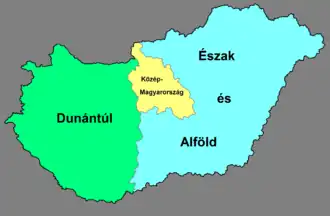 V prvním stupni dělení NUTS je Maďarsko rozděleno na tři tzv. části státu (Országrész). Ve druhém stupni je rozděleno na sedm regionů a ve třetím na devatenáct žup a hlavní město.