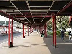 Zastřešení prvního nástupiště tvoří v půdorysu tři obdélné dílce orientované z jiho-západu na severo-východ, u druhého a třetího nástupiště se jedná pouze o dílce dva. Mezi dílci je mezera bez zastřešení využitá pro umístění lam veřejného osvětlení. Kryt nástupiště není napojen na kryt výstupu z metra. Ke střeše prvního nástupiště je ještě připojen objekt, který je z jeho severo-východní části veden zpět na západ a má obdélný charakter. Vzniká tak v půdorysu nedokončené písmeno V, v jehož rozevření se nachází zeleň. Tato část byla projektována jako dispečerské stanoviště, toalety a další zázemí dopravního podniku.