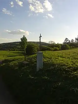 Asi 100 metrů jihovýchodně od vrcholu se nachází kovový křížek (krucifix) zasazený v kamenném soklu a odpočinková lavička. Méně romantickou zajímavostí je trasa 420 elektrického vedení 400 kV[pozn. 1] vedoucí z rozvodny Hradec u Kadaně do rozvodny Mírovka, které vrchol míjí asi 300 metrů východně[ref. 3].