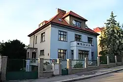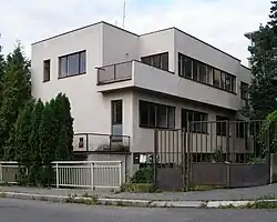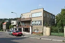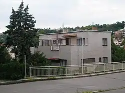 Václav Velvarský | Kubická stavba rodinného domu obzvláštňují visuté balkony a terasa ve vyšším podlaží, která je doplněna slunolamy ze železobetonu. Terasa realizovaná nad vchodem postupně přechází do visutého balkonu, který ale má plnou poprsnici. Střecha vily je plochá. Vchod byl v pozdějších letech doplněn mřížovými vraty, která se ale v původním Velvarského projektu nevyskytovala.[11] | 1932 | 50°7′2″ s. š., 14°27′14″ v. d. | |