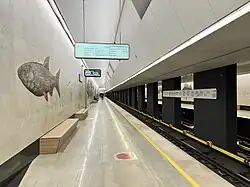 Nástupiště s mozaikou ryby během výstavby stanice -
