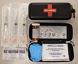 Naloxon je součástí balíčků rozdávaných závislým na heroinu či dalších opioidech. Bylo prokázáno, že tyto balíčky snížily úmrtnost v důsledku předávkování opioidy.[15] Předepsání naloxonu se doporučuje v případě, že uživatel je závislý na vysoké dávce opioidů (rovnající se více než 100 mg morfinu za den). Předepisuje se také v případě, že uživatel užívá opioidy spolu s benzodiazepiny nebo je podezření či jistota, že užívá opioidy bez lékařského předpisu.[16] Předepsání naloxonu by mělo být doplněno standardními doporučeními o užití přípravku, součástí doporučení by měla být prevence, informace o rozpoznání a reakci na předávkování, informace o první pomoci a o zavolání zdravotnické záchranné služby.[17]