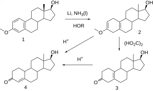 Tato reakce, nyní známá jako Birchova redukce[35] je typickou úpravou monomethyletheru estradiolu (1) roztokem lithného kovu v kapalném amoniaku za přítomnosti alkoholu jako zdroje protonů. Počátečními reakčními složkami 1,4-dimetalace polohy nejvíce elektronových deficitů aromatického kruhu - v případě estrogenu v pozicích 1 a 4. Rxn meziproduktu s protonovým zdrojem vede k dihydrobenzenu; Zvláštní citem této sekvence u steroidů je fakt, že dvojná vazba v poloze 2 se v podstatě stává enol etherovou skupinou. Zpracování tohoto produktu (2) se slabou kyselinou, například kyselinou šťavelovou, vede například k hydrolýze enolového etheru, čímž vzniká β, γ-nekonjugovaný keton 3. Hydrolýza za náročnějších podmínek (minerální kyseliny) vede k migraci / konjugaci olefinu za vzniku nandrolonu (4).