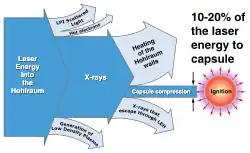 Základním konceptem ICF je stlačit malé množství paliva, aby se dosáhlo tlaku a teploty nezbytné pro fúzi. NIF provozuje celosvětově nejvýkonnější laser[pozn. 1]. Záření z laseru zahřívá vnější vrstvu kuličky paliva, která se vypaří a přemění na plazma, přitom stlačí zbývající palivo uvnitř. Zrychlení při implozi se pohybuje v řádu 1014 m·s−2, maximální rychlost tak během několika nanosekund dosahuje 350 až 400 km/s.[4][5] Během okamžiku dojde ke zvýšení hustoty paliva z přibližně hustoty vody na přibližně 100násobek hustoty olova. Dodávka energie a adiabatický ohřev během imploze zvýší teplotu paliva na stovky milionů kelvinů. Při těchto teplotách a tlacích dojde k fúzním reakcím během krátkého časového intervalu, než palivo exploduje a jeho teplota a hustota klesnou.[6]