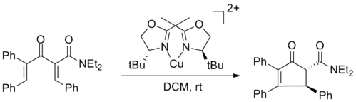 První chirální Lewisovu kyselinu vyvolávající asymetrickou Nazarovovu cyklizaci popsal Varinder Aggarwal; pomocí měďnatých komplexů s bisoxazolinovými ligandy dosáhl enantiomerních přebytků až 98 %. Při použití 50 mol% měďnatého komplexu se enantiomerní přebytek nezměnil, ale výtěžnost byla výrazně nižší.[2]